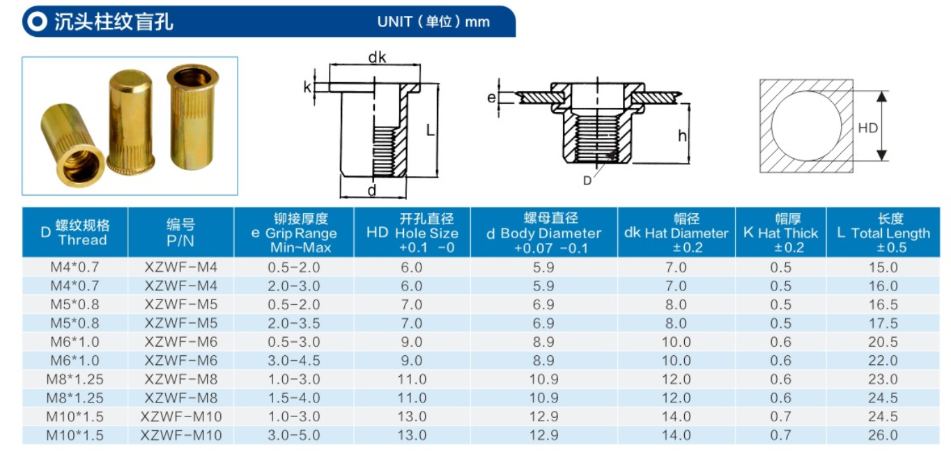 產品特點:盲孔鉚(liu)螺(luo)(luo)母又稱為封閉型(xing)鉚(liu)螺(luo)(luo)母小沉(chen)頭鉚(liu)螺(luo)(luo)母是沉(chen)頭鉚(liu)螺(luo)(luo)母改(gai)進型(xing)并且不需要