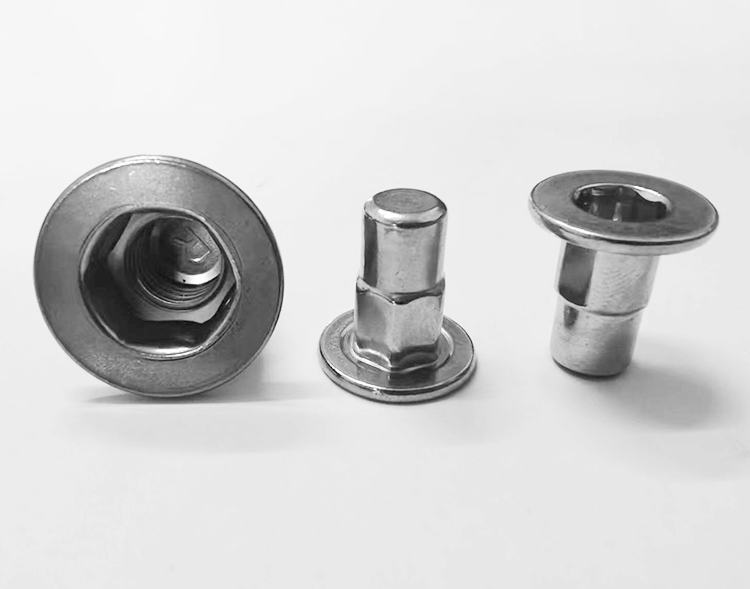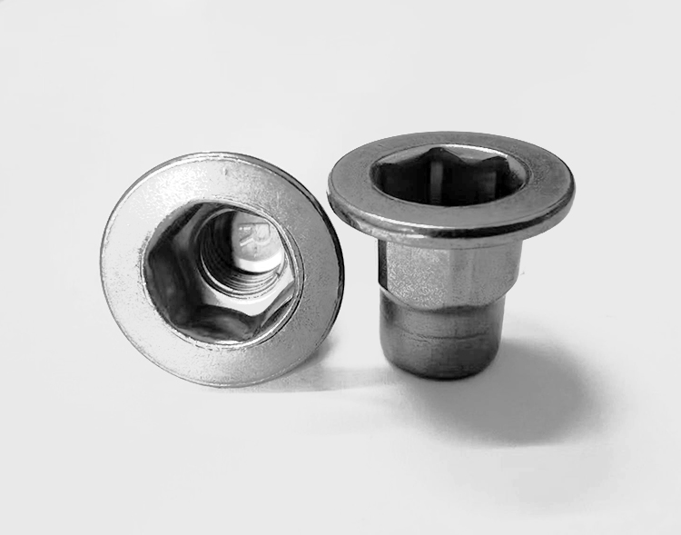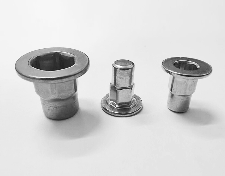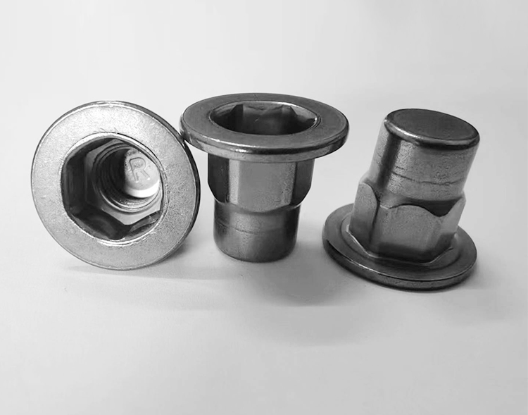產品特點:工件六角形開孔配合六角形鉚螺母,可使其達到最大防轉效果。盲孔的設計具有密閉防水特點