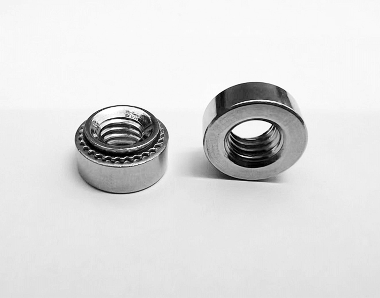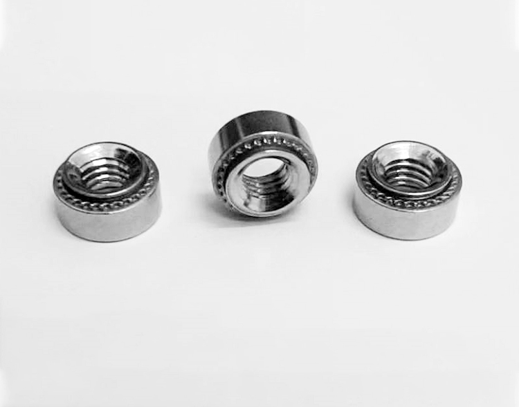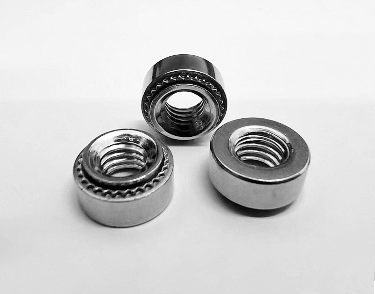 產品特點:壓鉚螺母又叫鉚螺母,自扣緊螺母,是應用于薄板或鈑金上的一種螺母,外形呈圓形,一端帶有壓花齒及導向槽。其原理是通過壓花齒壓入鈑金的預置孔位,一般而言預置孔的孔徑略小于壓鉚螺母的壓花齒,通過壓力使壓鉚螺母的花齒擠入板內使預置孔的的周邊產生塑性變形,變形物被擠入導向槽,從而產生鎖緊的效果。